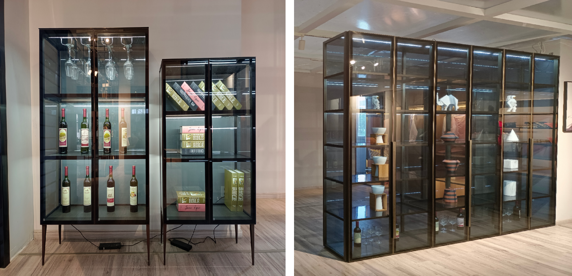 Aluminum glass cabinets with doors allow items to be clearly displayed while effectively protecting them from dust. This significantly reduces daily cleaning efforts and is ideal for books, wine collections, and decorative items.